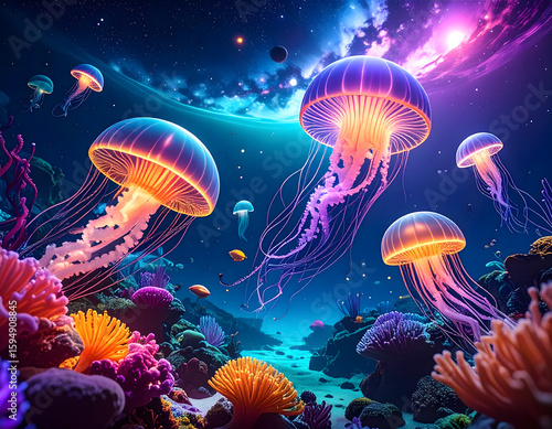 Bioluminescent jellyfish float in a vibrant, colorful underwater scene beneath a starry, cosmic sky.