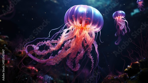 Bioluminescent jellyfish floating in deep sea