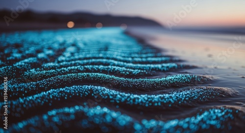 Bioluminescent waves glow on dark sandy beach at dusk