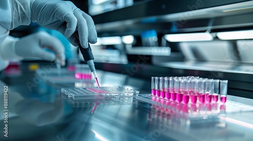 Biomedical Engineer laboratory scene with a robotic pipette dispensing pink liquid into a microplate