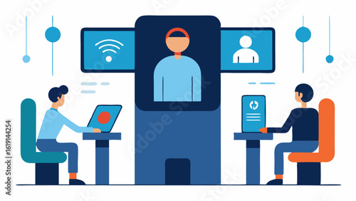 Biometric Assessment Station An illustration of a hightech station where individuals sit to receive biometric assessments with sensors and displays showing realtime data.