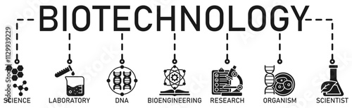 Biotechnology banner web icon vector illustration concept with icon of science, laboratory, dna, bioengineering, research, organism, and scientist