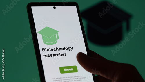 Biotechnology researcher program. A student enrolls in courses to study, to learn a new skill and pass certification. Text in English