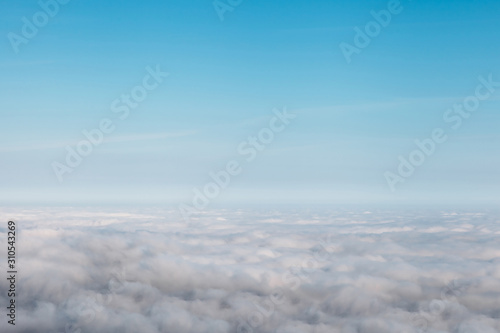 bird eye view at clouds in blue sky top view from drone from airplane window