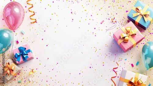 Birthday background with multicolor gift boxes with multicolor bows and ribbons on a high glossy background. Happy birthday background with copy space