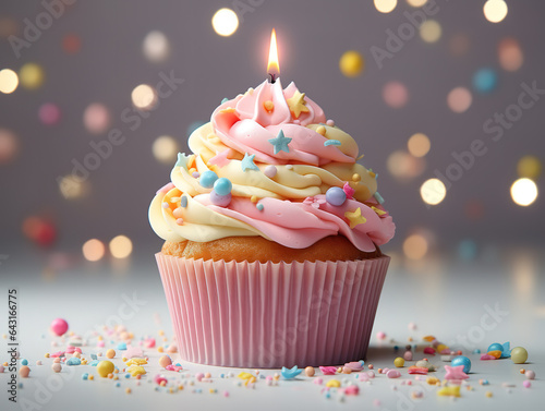 Birthday cupcake with a candle on a light pink background. Generative Ai