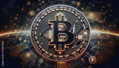 Bitcoin blockchain network around the world, global, digital currency, peer to peer, node concept, miner, cryptocurrency, decentralized finance, generative ai