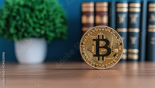 Bitcoin coin displayed on wooden table with books and plant in background