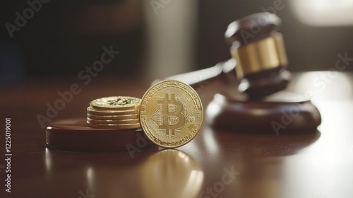 Bitcoin Coin on Wooden Gavel with Gold Coins in Background