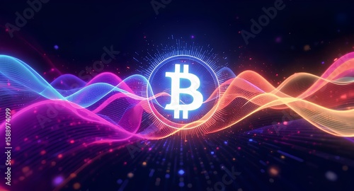 Bitcoin cryptocurrency digital technology concept glowing symbol with abstract neon waves blockchain