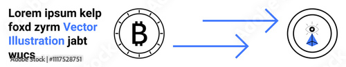 Bitcoin symbol coin, smart contract logo, blue arrows for transfer process. Ideal for cryptocurrency themes, digital currency exchange, blockchain technology, financial transactions, decentralized
