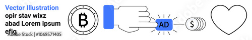Bitcoin symbol, hand pointing at AD button, dollar sign, and heart shape. Ideal for cryptocurrency, finance, digital marketing, online ads, fintech, investment, and technology themes. Landing page