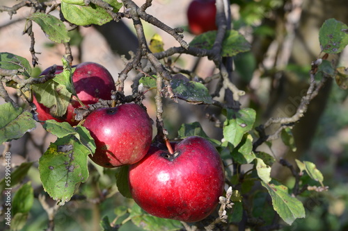 Bitter rot also known as monilia or moniliosis of red apple on the branch with blurred background in autumn garden