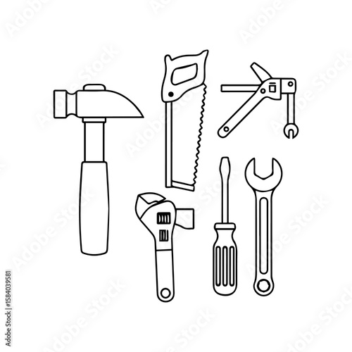Black white tools line drawing hammer saw adjustable wrench screwdriver spanner toggle joint pliers