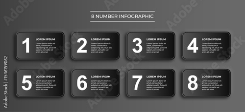 Black 3D Button Boxes with 8 Numbered Bullet Points – Vector UI Elements for Dark Web and Interface Design