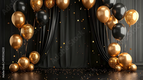 Black and gold balloons and confetti on a black background.