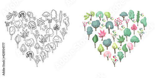 Black and white and colored heart made of different trees. Illustration can be used for coloring book and pictures for children.