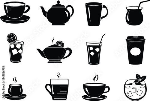 Black and White Beverage Icon Set – Monochrome Drink Illustrations of Cups, Mugs, Teapots, and Glasses for Cafe Branding, Kitchen Decor, and Menu Design Projects