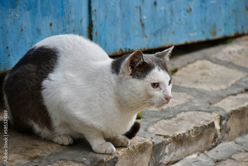 Black and White Cat Crouched on Stone Doorstep in front of Blue Door in Tunis Medina