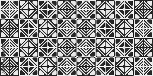Black and white checkered tiles with patterned rhombuses inside. Vector for print and different design.