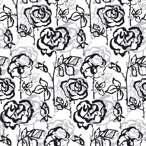 Black and white concept rose flower seamless pattern for surface design, wrapping paper, background, fabric. Hand drawn floral sketch in modern shabby style.