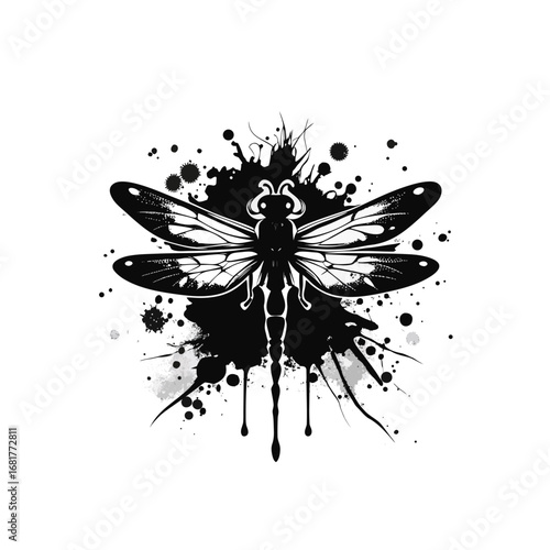 Black and White Dragonfly with Ink Splatter Vector Icon