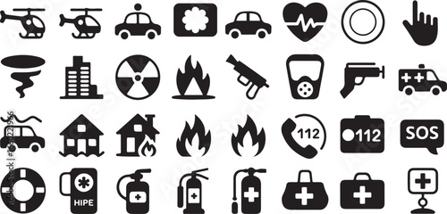 Black and white emergency and safety icons including helicopter car ambulance fire tornado radiation symbols