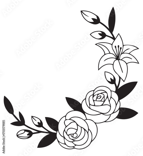 Black and white floral corner with solid leaves and rose outlines