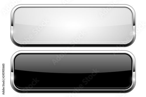 Black and white glass buttons. Shiny rectangle 3d web icons