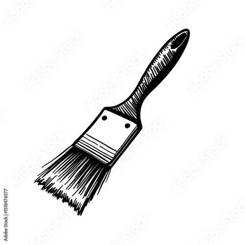 Black and white hand drawn paint brush with thick bristles and classic handle. Concept of home painting and wall coloring - renovation - DIY