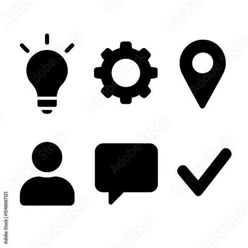 Black and White Icons Idea, Settings, Location, User, Communication, and Check Mark