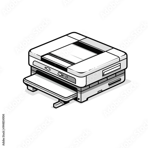 Black and white illustration of a modern scanner with an open tray, showcasing simplistic design.