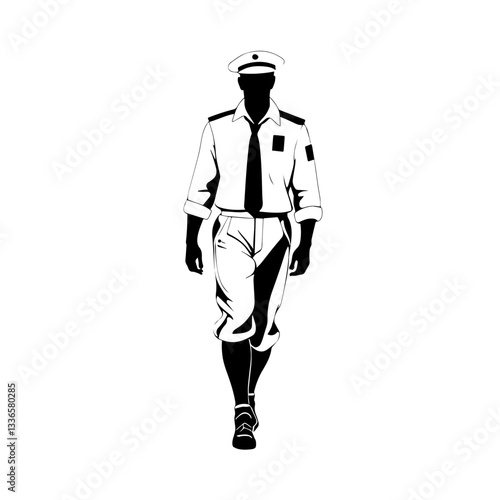 Black and white illustration of a Uniformed officer walking confidently in a professional setting during daylight hours