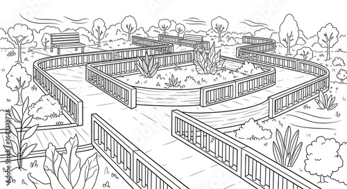 Black and White Illustration of Park Aerial View with Circular Building Walkway Pillars and Trees in an Outdoor Setting