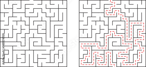 Black and white labyrinth puzzle with red solution route showing the correct path