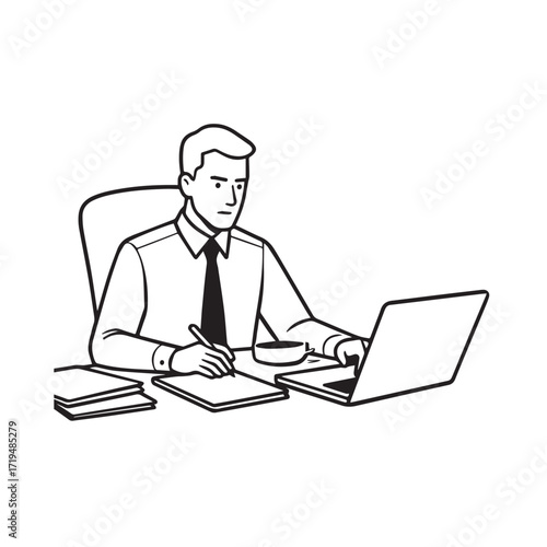Black and white line art of a hardworking man at office desk with laptop and documents minimalist illustration