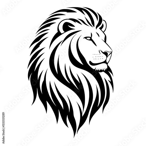 Black and white lion head illustration with a flowing mane, representing power, leadership, and strength in nature.