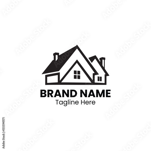 Black and white logo of three houses with a brand name and tagline on a white background design