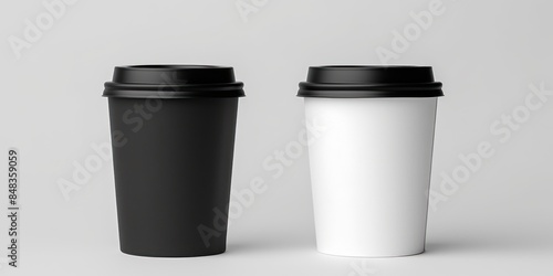 Black and White Paper Coffee Cups on Light Background. Disposable Coffee Cups, Minimalist Aesthetic. Generative AI