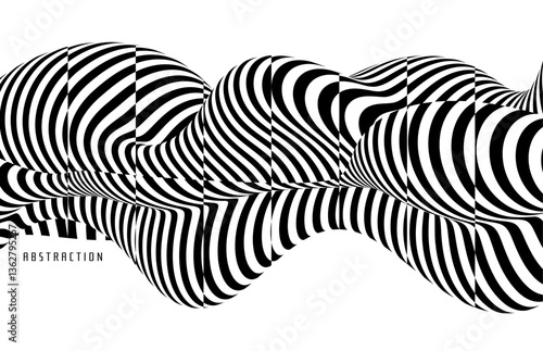 Black and white pattern. Optical illusion dynamic pattern with displacement from multiple sliced lines. Abstract striped background. 3D vector for cover, interior design or print.