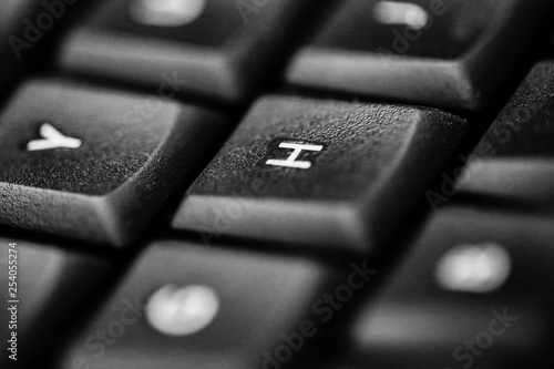 Black and white photo of a close up computer keys with letters from a pc keyboard
