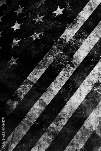 Black and white photo of the American flag with stars. The image has a vintage and worn look to it, giving it a sense of history and nostalgia