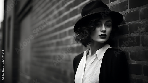 Black and white photograph of a person dressed in 1920s fashion, posing against an old brick building