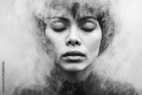 Black and white portrait of a serene woman with closed eyes, surrounded by ethereal smoke, conveying a sense of calm and introspection