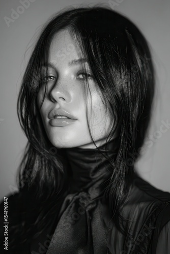 Black and White Portrait of Woman with Dark Hair: Soft Light, Direct Gaze, Elegant Style, Freckles Detail