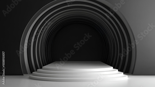 Black and white round tunnel podium abstract background. Stage with reflections on the glossy floor,Empty corridor of several round arches in perspective with black walls, white floor and shadows.
