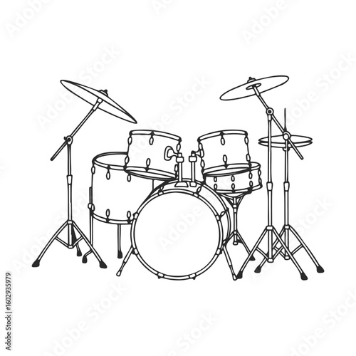 Black and white sketch of acoustic drum set with cymbals and stands – stock vector icon in line style