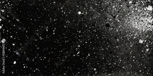 Black and white speckled texture with scattered white dots on dark background. Abstract spray paint or snow effect overlay with gradient fade and particle dispersion. 8k banner with copy space