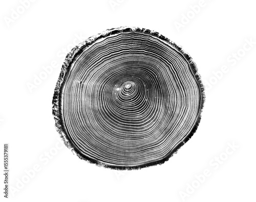 Black and white stamp of wood texture of tree rings from a slice of log. Negative image of cut tree slice, isolated on white background