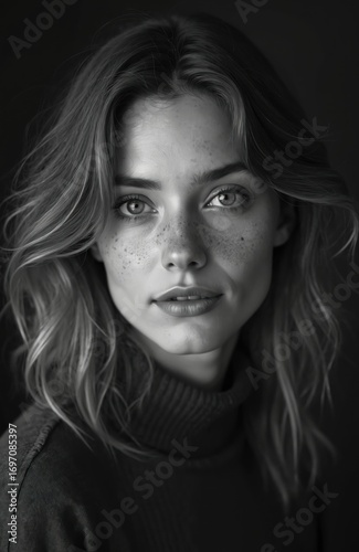Black and white studio portrait of young woman with freckles. Her wavy hair frames face with expressive eyes and subtle smile. She wears dark turtleneck sweater, creating classic, elegant look.